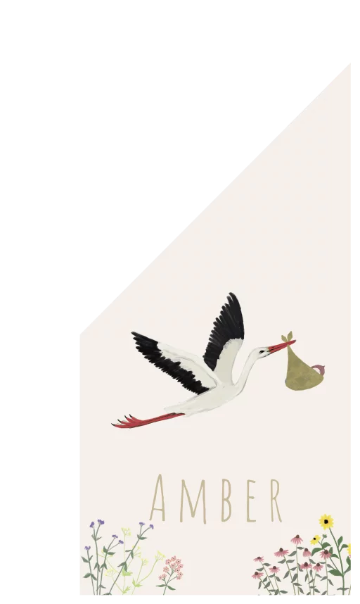 Geboortevlag met een prachtige ooievaar met een kindje en zomerbloemen. Gemaakt van een weerbestendige, stevige PVC stof (610 g/m²). Exclusief vlaggenstok.