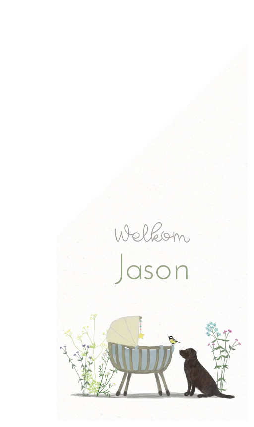 Geboortevlag met een trotse labrador bij een rotan wiegje. Gemaakt van een weerbestendige, stevige PVC stof (610 g/m²). Exclusief vlaggenstok.