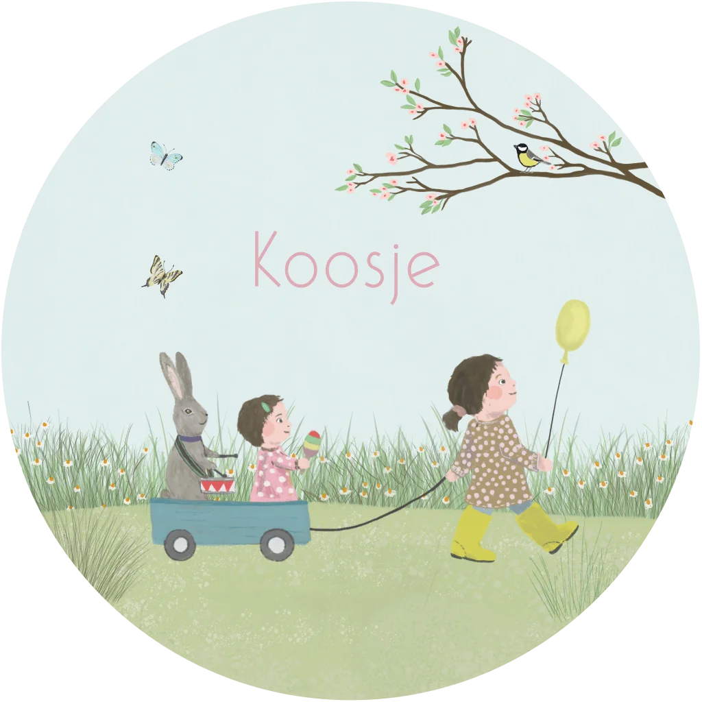Vrolijk rond geboortekaartje met een trotse grote zus met haar kleine zusje en een konijntje. Maak dit kaartje helemaal naar wens in de online editor.