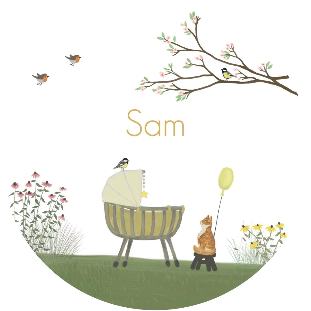 Prachtig rond geboortekaartje met een trotse rode kat bij een rotan wiegje. Met veel vogeltjes en zomerse bloemen. Maak dit kaartje helemaal naar wens in de online editor.