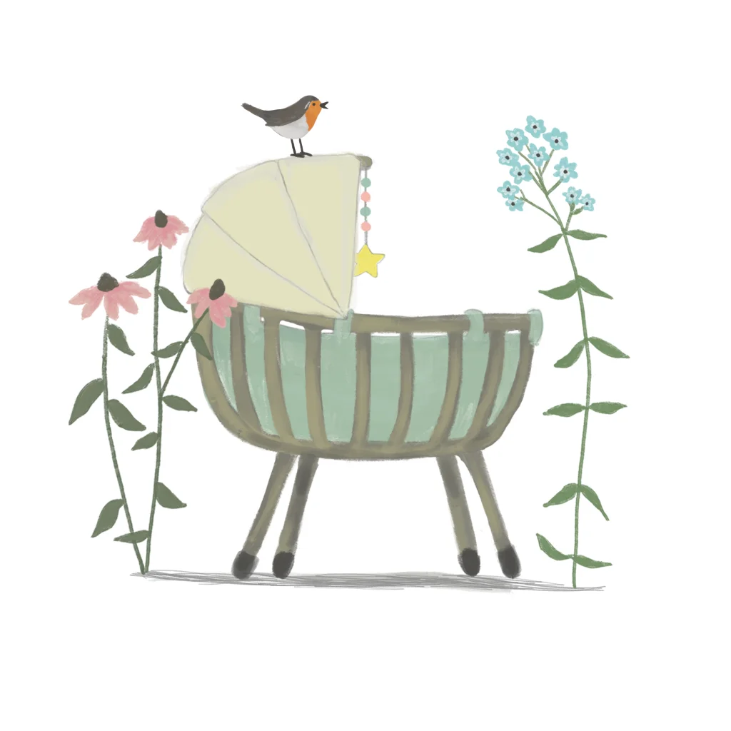 Mooie sluitzegels met een illustratie van een rotan wiegje, een nieuwsgierig roodborstje en zomerse bloemen. Je kunt de sluitzegel helemaal naar wens aanpassen. Er zitten 25 sluitzegels op een vel.