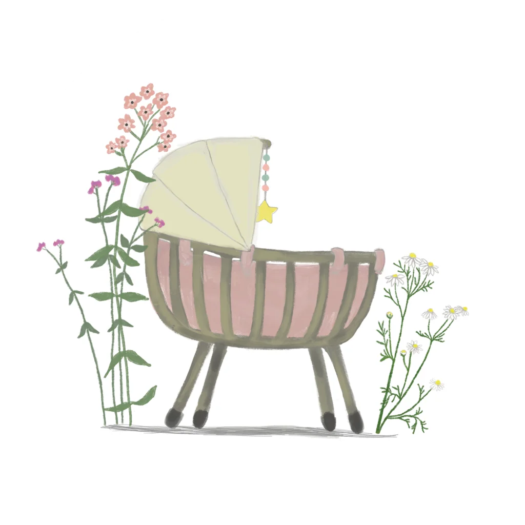 Mooie sluitzegels met een illustratie van een roze rotan wiegje en zomerse bloemen. Je kunt de sluitzegel helemaal naar wens aanpassen. Er zitten 25 sluitzegels op een vel.
