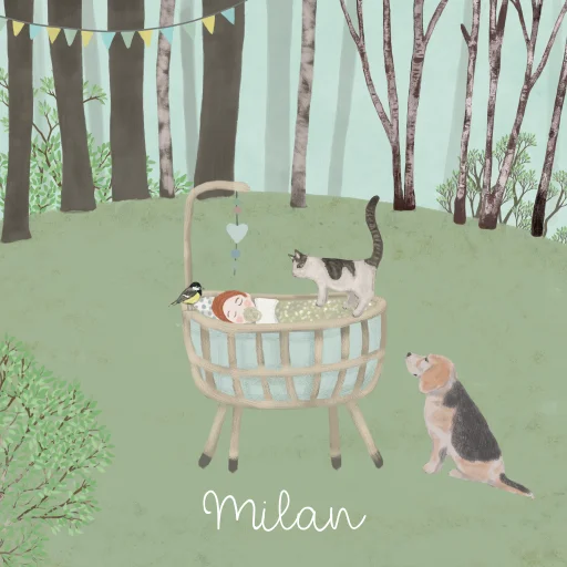 Prachtig geboortetegeltje van een kinderwagen met een trotse kat en Beagle in een bos. Je kan de hond eenvoudig worden vervangen door een grote zus of een andere kat, waardoor de poster volledig aan jouw persoonlijke situatie kan worden aangepast. Formaat: 15x15 cm.