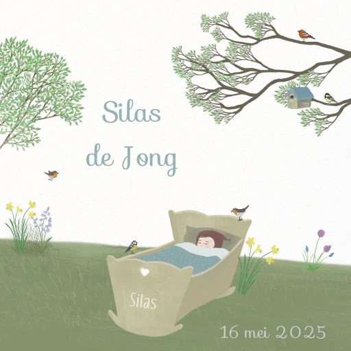 Lief tegeltje van tuinvogeltjes bij een wiegje met lentebloemen. Je kunt het tegeltje zelf personaliseren in de editor. Formaat: 15x15 cm.