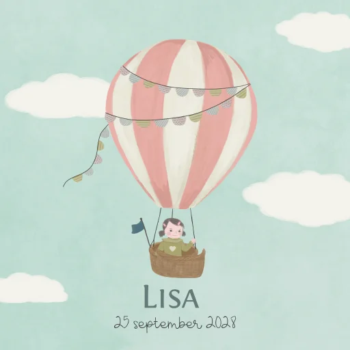 Vrolijk tegeltje met luchtballon. Een prachtige herinnering voor je kindje. Je kunt het tegeltje zelf helemaal naar wens maken in de editor. Formaat: 15x15 cm.