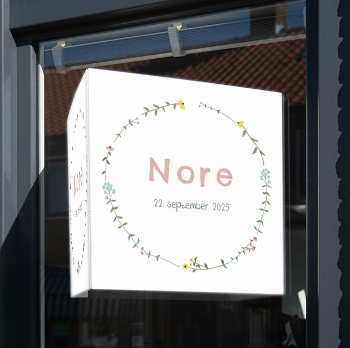 Lief raambord (dubbel, vierkant) met een illustratie van bloemenkrans. Dit raambord, zgn. 'makelaarsbord', is gemaakt van stevig en weerbestendig kunststof (3,5 mm dik kanaalplaat). Het ontwerp wordt op beide zijden aangebracht waardoor het van alle kanten goed zichtbaar is. Het is eenvoudig op het raam te bevestigen met een plakrand.