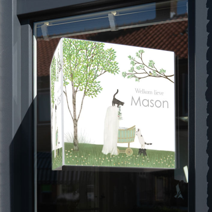 Lief raambord (dubbel, vierkant) met vrolijke trotse katten. Dit raambord, zgn. 'makelaarsbord', is gemaakt van stevig en weerbestendig kunststof (3,5 mm dik kanaalplaat). Het ontwerp wordt op beide zijden aangebracht waardoor het van alle kanten goed zichtbaar is. Het is eenvoudig op het raam te bevestigen met een plakrand.