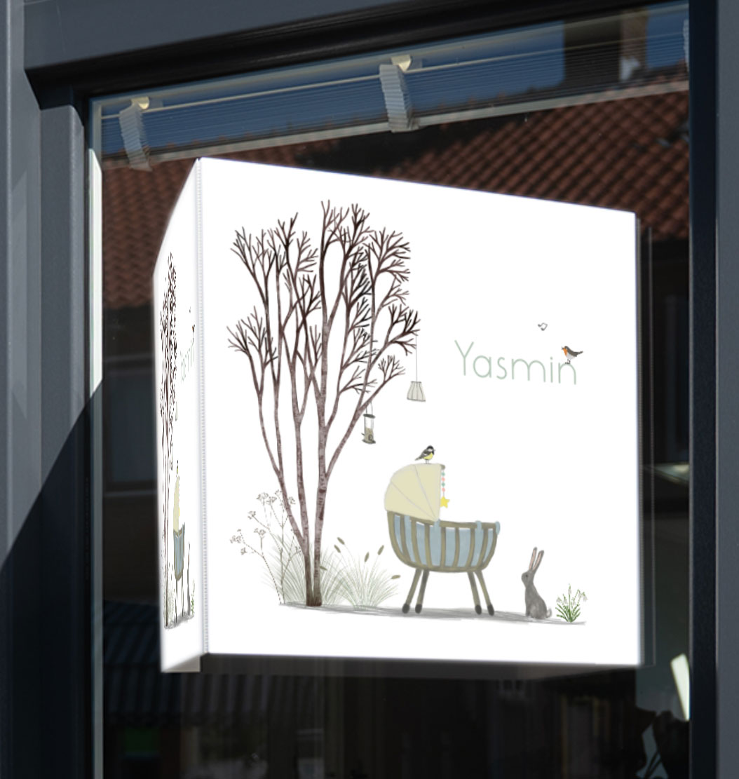 Lief raambord (dubbel, vierkant) met de illustratie van een konijntje bij een rotan wiegje in een winter landschap. Dit raambord, zgn. 'makelaarsbord', is gemaakt van stevig en weerbestendig kunststof (3,5 mm dik kanaalplaat). Het ontwerp wordt op beide zijden aangebracht waardoor het van alle kanten goed zichtbaar is. Het is eenvoudig op het raam te bevestigen met een plakrand.