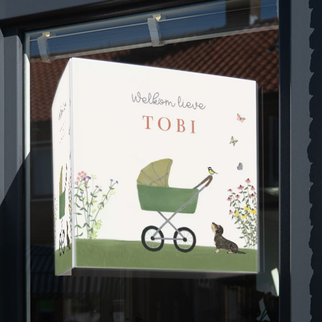 Op zoek naar een uniek raambord voor de aankondiging van de geboorte van je kindje? Het dubbele vierkante raambord met de illustratie van een Duitse teckel bij een wandelwagen is een perfecte keuze. Dit raambord, ook wel bekend als een 'makelaarsbord', is vervaardigd van stevig en weerbestendig kunststof (3,5 mm dik kanaalplaat). De afbeelding wordt aan beide zijden aangebracht, waardoor het vanuit alle hoeken goed zichtbaar is en kan eenvoudig op het raam bevestigd worden met behulp van de plakrand.