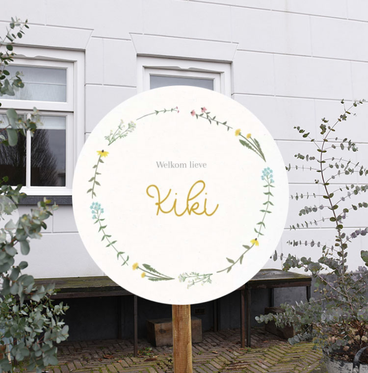 Lief geboortebord om de geboorte van je kindje bekend te maken in de buurt. Dit ronde geboortebord heeft een illustratie van een prachtige bloemenkrans met kamille en paardenbloemen. Je kunt het tuinbord zelf personaliseren in de editor. Het bord heeft een diameter van 80 cm. Exclusief paal en bevestigingsmateriaal.