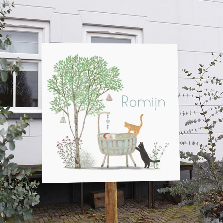 Vrolijk tuinbord met trotse katten bij het wiegje van je kindje. Met mooie zomerbloemen een prachtige bekendmaking van de geboorte van je kindje. Je kunt het tuinbord zelf personaliseren in de editor. Exclusief paal en bevestigingsmateriaal.