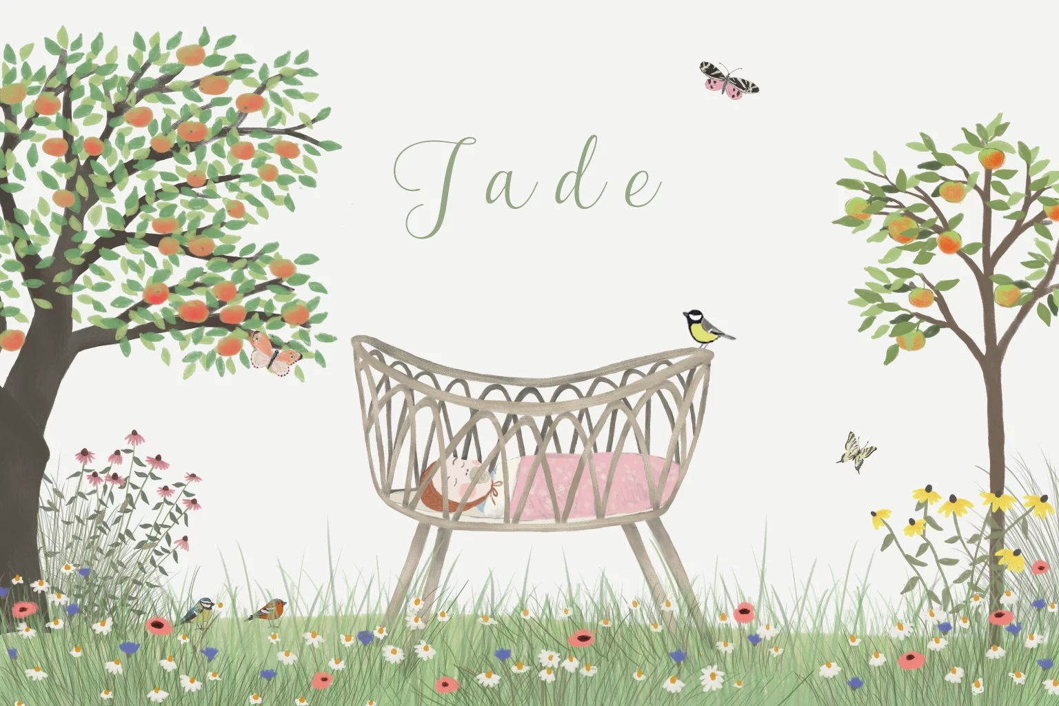 Lief geboortekaartje van een wiegje in een kleurijke appelboomgaard met vrolijke veldbloemen, vlinders en vogels. Teksten en illustraties kunnen worden aangepast voor een extra persoonlijk kaartje.