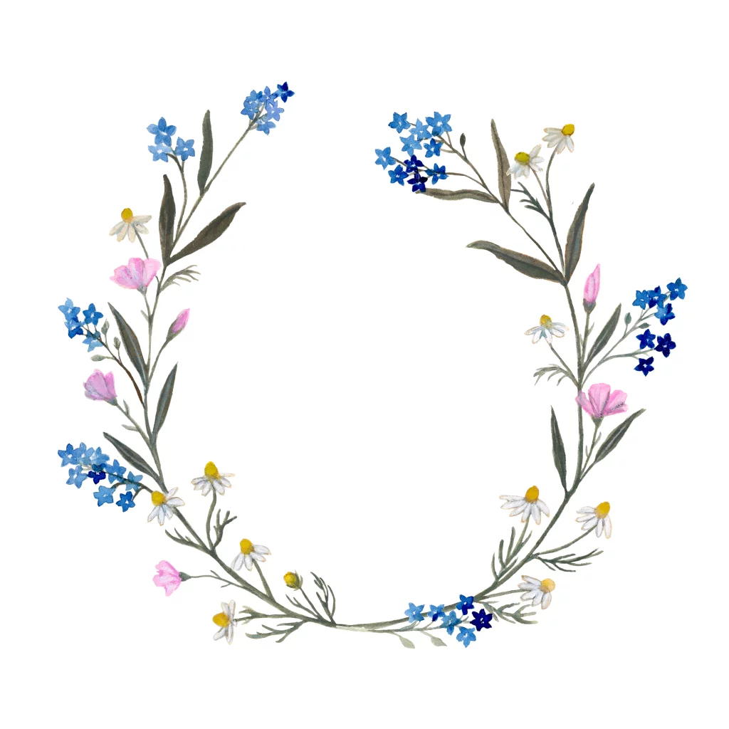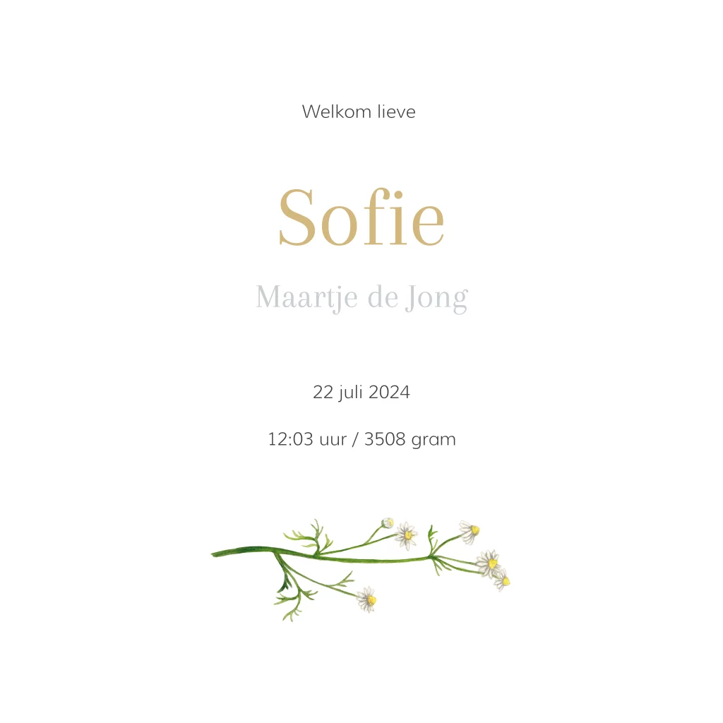 Lief geboortekaartje met een prachtige bloemenkrans met kamille en vergeet-me-nietjes. De bloemen zijn geschilderd met gouache. Je kunt de kaart zelf helemaal naar wens maken in de editor. Niet alleen de lettertypes en -kleuren kun je aanpassen, maar je kunt ook (bijna) alle illustraties vervangen of illustraties en je eigen foto’s toevoegen! Mix & match!