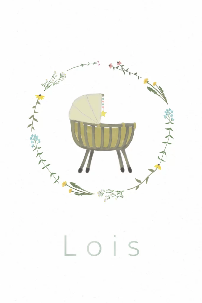 Lief geboortekaartje met een wiegje in een prachtige bloemenkrans. Je kunt de kaart zelf personaliseren in de editor. Mix & match met verschillende illustraties en kleuren om een uniek geboortekaartje te creëren dat perfect past bij je stijl.