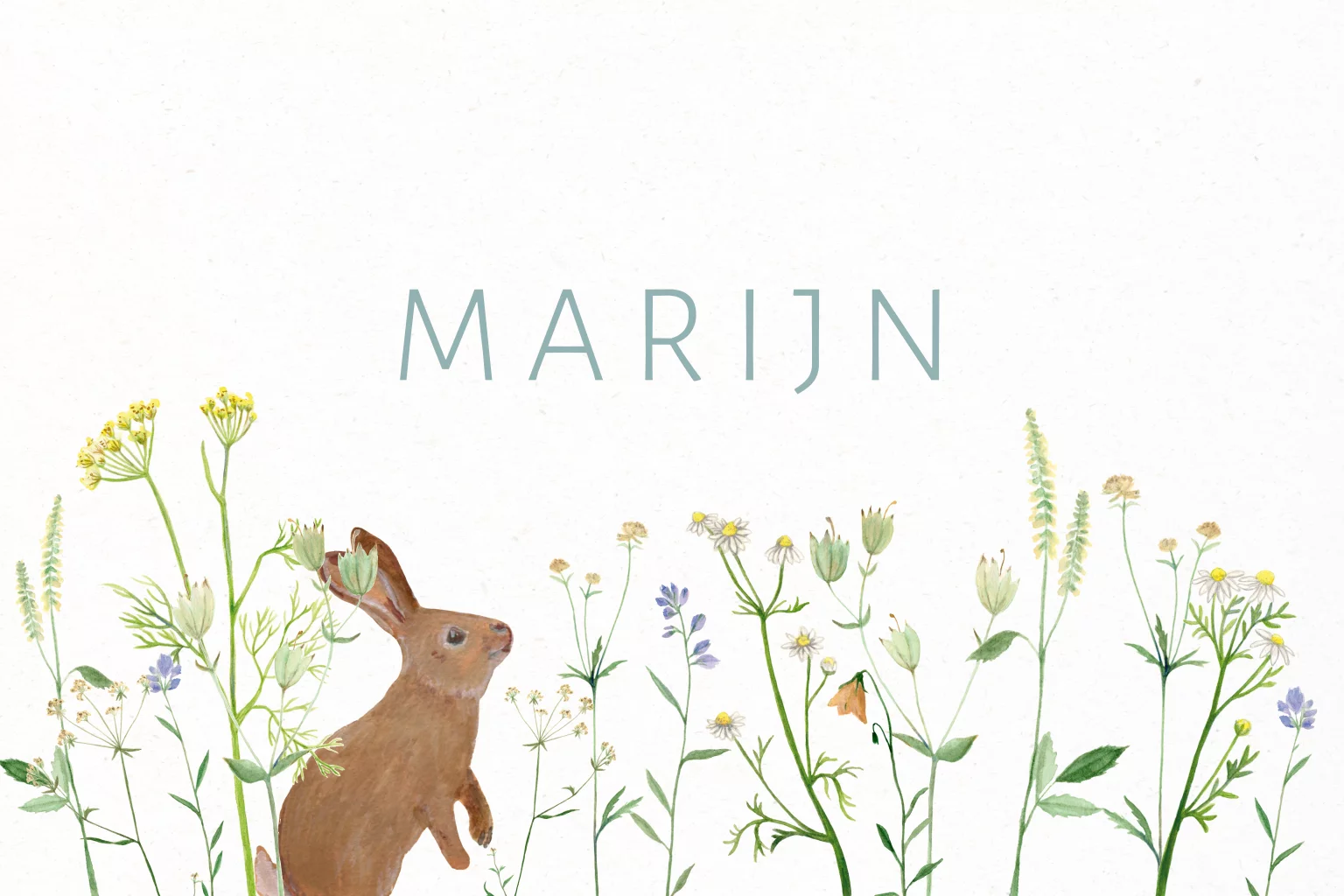 Een lief geboortekaartje met een konijn en geschilderde veldbloemen.