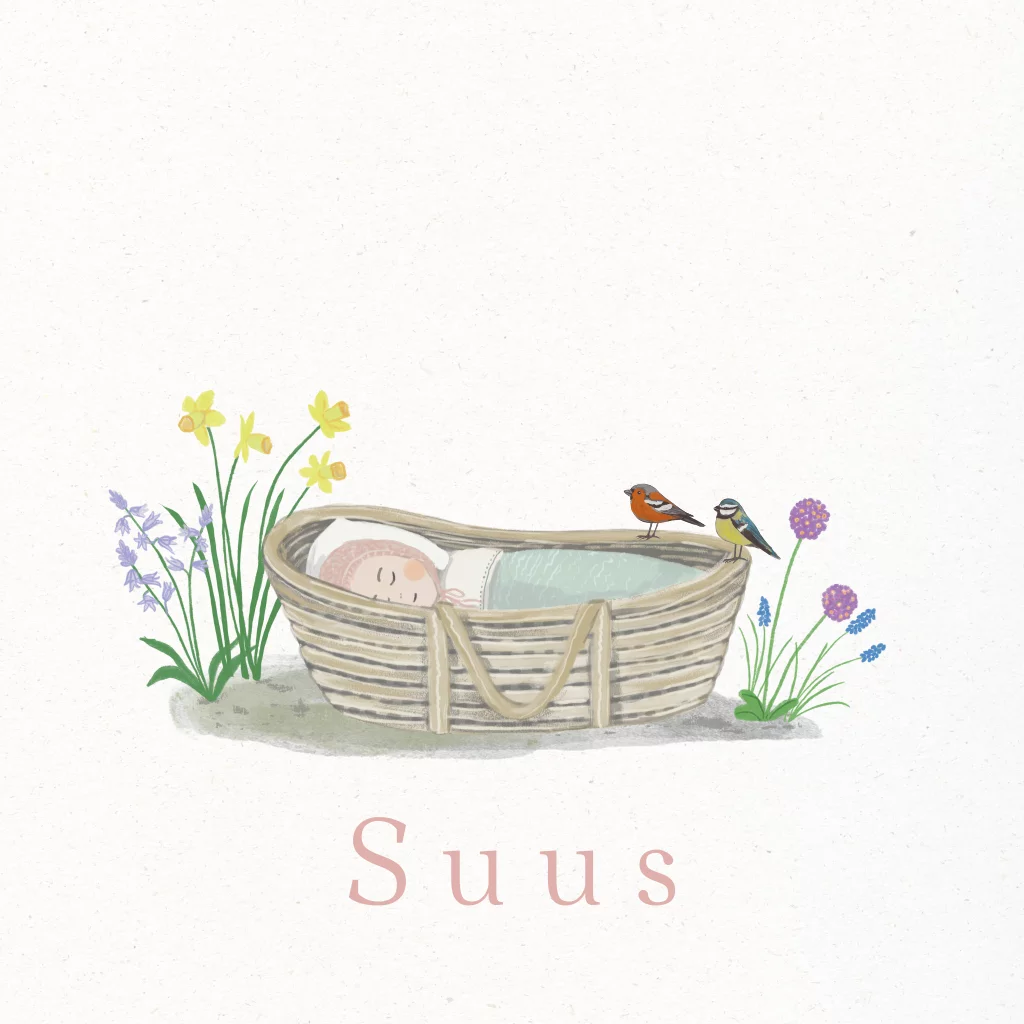 Lief verfijnd geboortekaartje met een Mozes maandje in een veld met lentebloemen. Een prachtige aankondiging van de geboorte van je kindje in de lente. Teksten en kleuren kunnen worden aangepast voor een extra persoonlijk kaartje. Alle illustraties kunnen worden vervangen door illustraties uit de uitgebreide beeldbank.