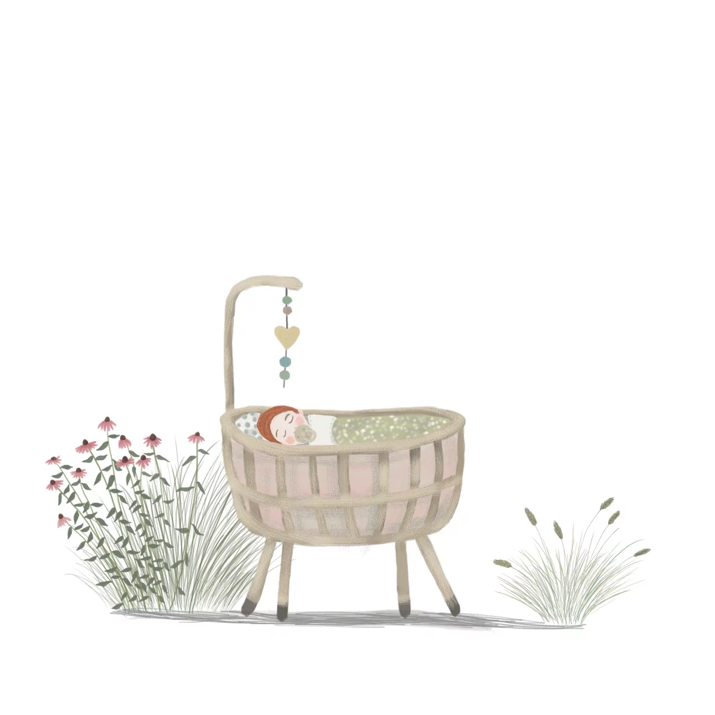 Lief verfijnd geboortekaartje met een rotan wiegje in een veld met wilde grassen en rode zonnehoeden. Een prachtige aankondiging van de geboorte van je kindje. De naam op de voorzijde van de kaart is in rose-goudfolie. Teksten en kleuren kunnen worden aangepast voor een extra persoonlijk kaartje. Alle illustraties kunnen worden vervangen door illustraties uit de uitgebreide beeldbank.