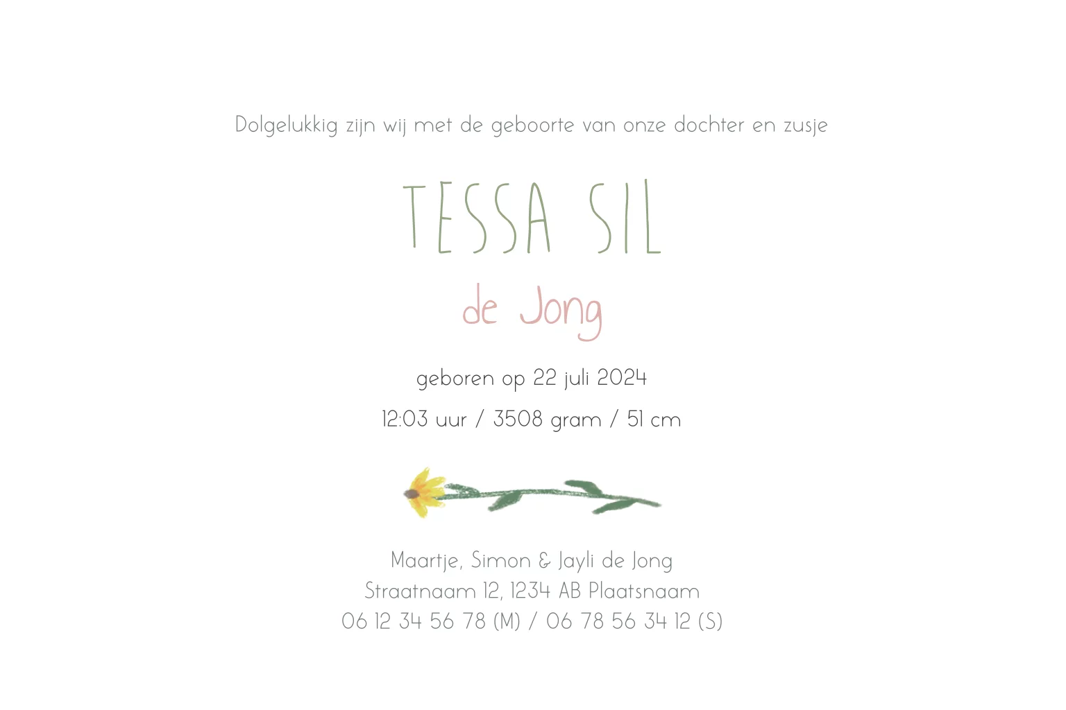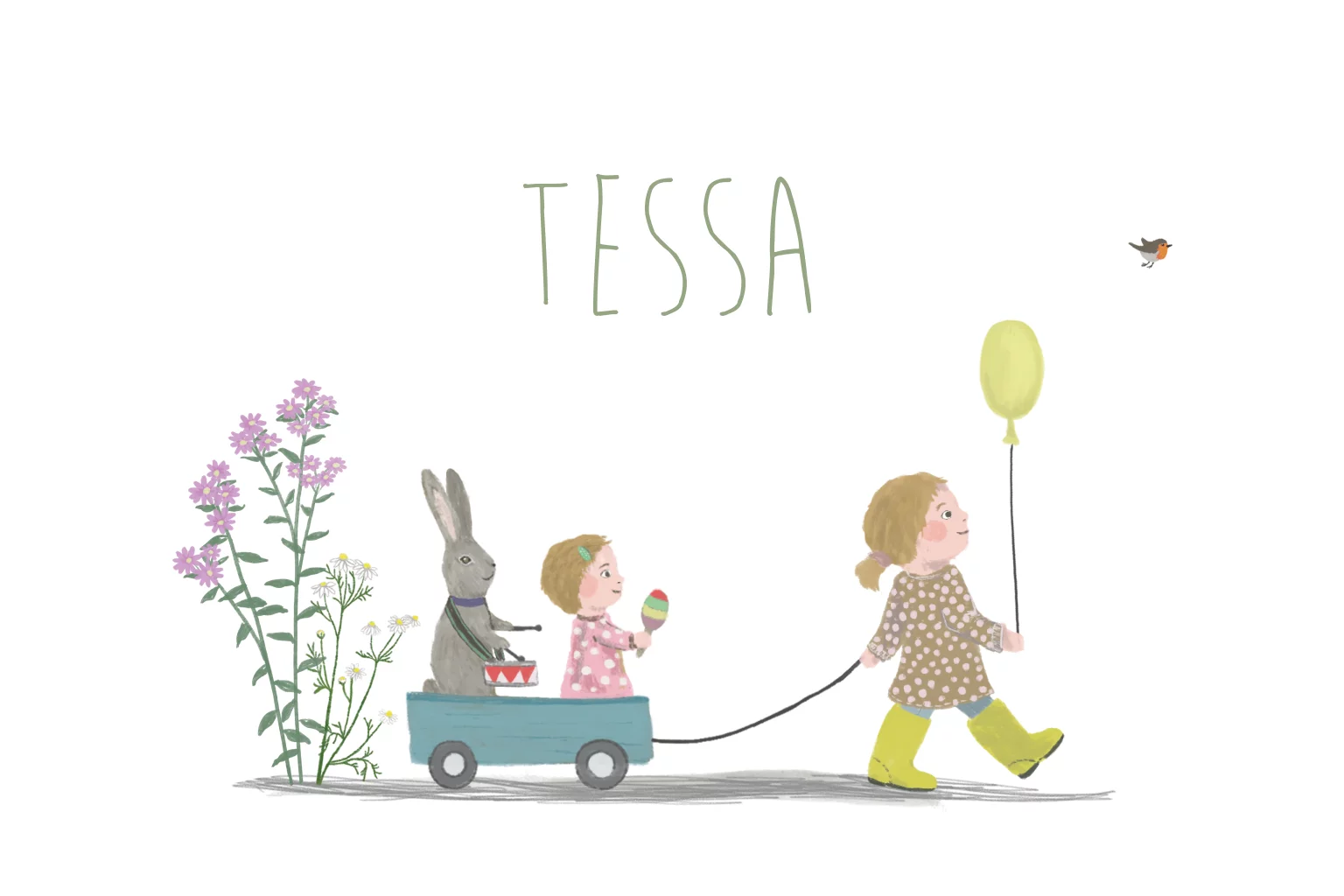 Dit geboortekaartje met een trotse grote zus en een trommelend konijn is een prachtige aankondiging van de geboorte van je kindje. Teksten en kleuren kunnen worden aangepast voor een extra persoonlijk kaartje. Alle illustraties kunnen worden vervangen door illustraties uit de uitgebreide beeldbank.