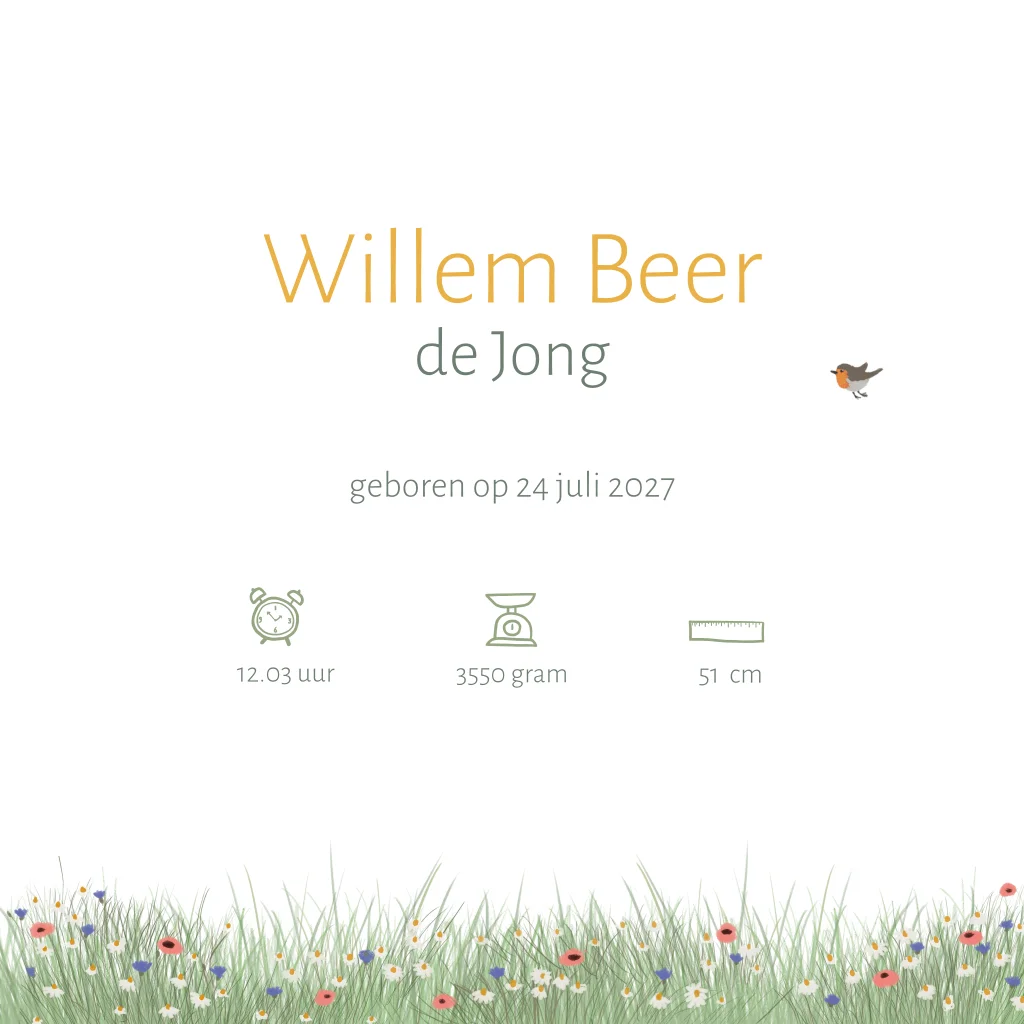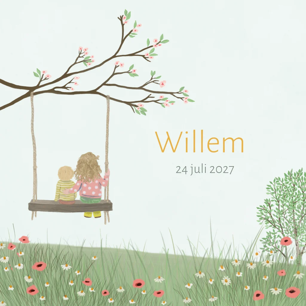 Kleurrijk geboortekaartje met een grote zus met haar kleine broertje op de schommel. In een veld vol vrolijke klaprozen, margrieten en korenbloemen. Een prachtige aankondiging van de geboorte van je tweede kindje in de lente of zomer. Je past de teksten, illustraties en kleuren heel gemakkelijk aan voor een extra persoonlijk kaartje.