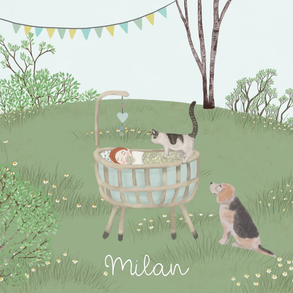 Dit geboortekaartje is een prachtige keuze voor de aankondiging van de geboorte van jullie zoontje. De illustratie toont een idyllische scène in een bos, waar een speelse kat en een trouwe Beagle bij het wiegje staan. De kleuren en teksten van dit kaartje zijn eenvoudig aan te passen, waardoor je een uniek en persoonlijk kaartje kunt creëren. Dit geboortekaartje is perfect voor ouders die houden van de natuur en een of meer huisdieren hebben.
