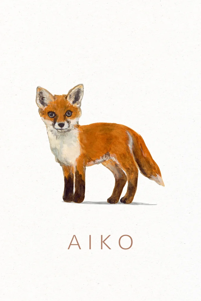 Mooi geboortekaartje van een lieve jonge vos. Het vosje is geschilderd met gouache. Pas het kaartje helemaal naar wens aan in de online editor.
