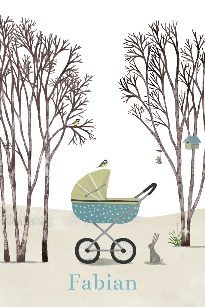 Lief verfijnd geboortekaartje met een kinderwagen met een nieuwsgierig roodborstje en konijntje in een winterse omgeving. Een prachtige aankondiging van de geboorte van je kindje in de winter. Teksten en kleuren kunnen worden aangepast voor een extra persoonlijk kaartje. Alle illustraties kunnen worden vervangen door illustraties uit de uitgebreide beeldbank.