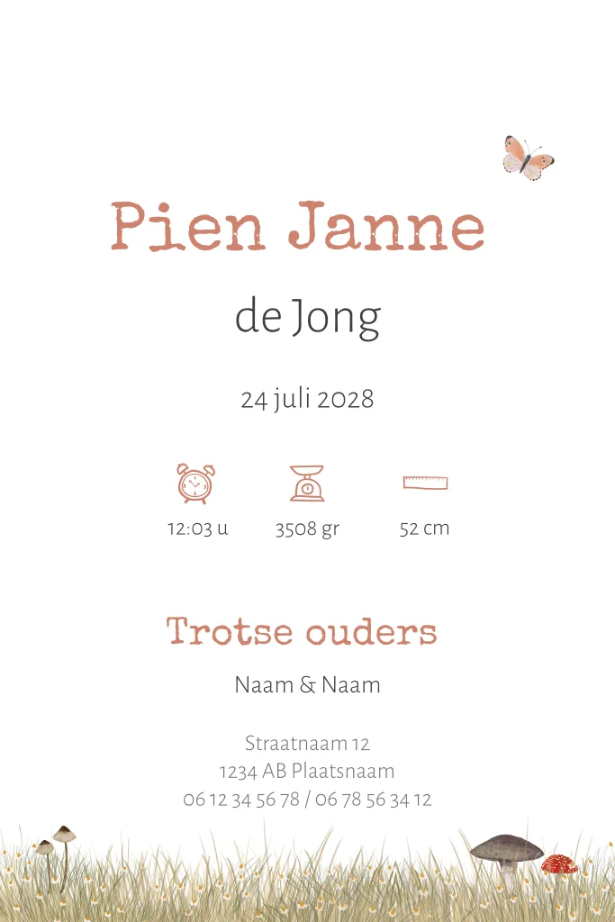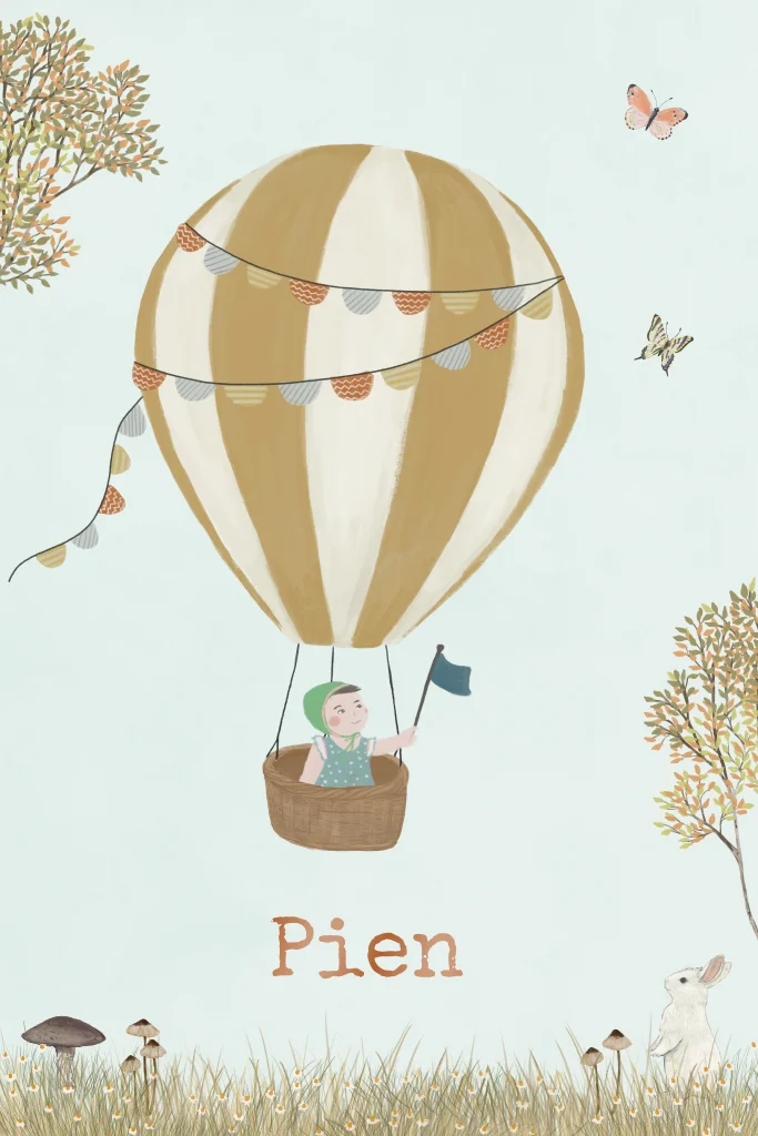 Vrolijk geboortekaartje van een luchtballon in een herfst omgeving. Een prachtige aankondiging van de geboorte van je kindje in de herfst. Teksten, illustraties en kleuren kunnen worden aangepast voor een persoonlijk kaartje.