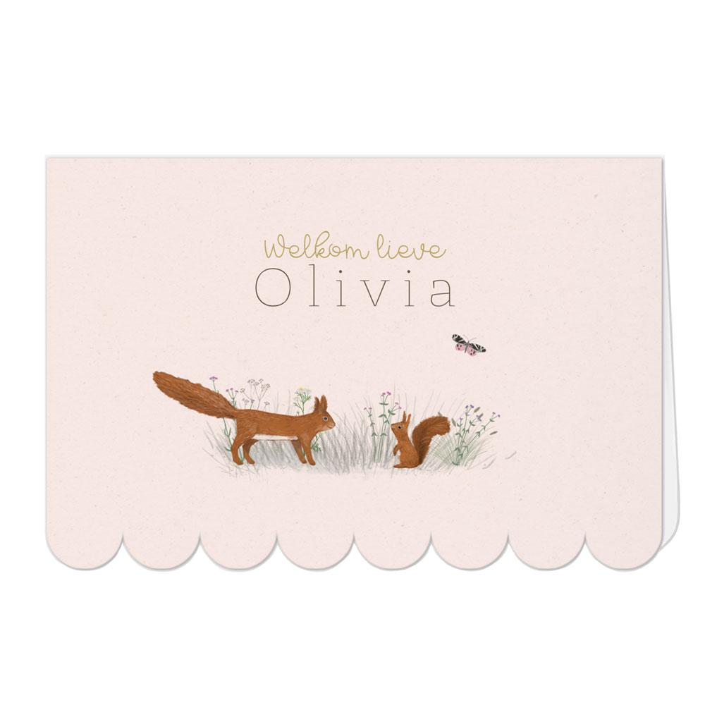 Lief geboortekaartje in prachtige luifelvorm. Met illustraties van eekhoorntjes en veldbloemen. Maak het kaartje en de illustraties persoonlijk in de editor.
