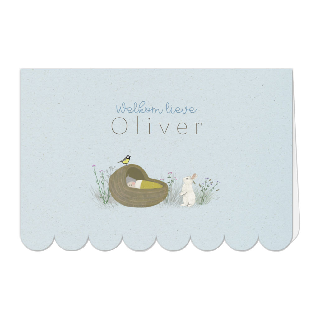 Lief geboortekaartje in een prachtige luifelvorm. Met illustraties van een kindje in een rieten mandje met een nieuwsgierig konijntje en veldbloemen. Maak het kaartje en de illustraties persoonlijk in de editor. Let op. Directe verzending (verzendservice) van luifelkaarten is niet mogelijk. Alleen beschikbaar als gevouwen kaart in formaat 10 x 15 cm.