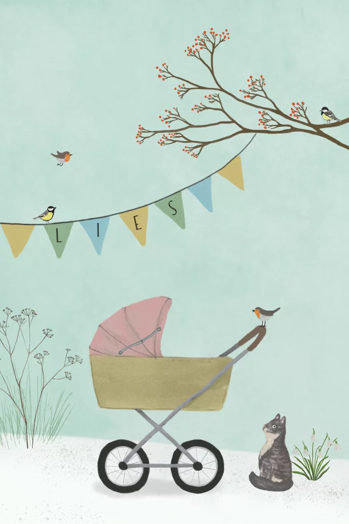 Dit geboortekaartje met een trotse poes en vogeltjes bij een kinderwagen in een winterse omgeving is een prachtige aankondiging van de geboorte van je kindje in de winter. Teksten en kleuren kunnen worden aangepast voor een extra persoonlijk kaartje. Alle illustraties kunnen worden vervangen door illustraties uit de uitgebreide beeldbank.