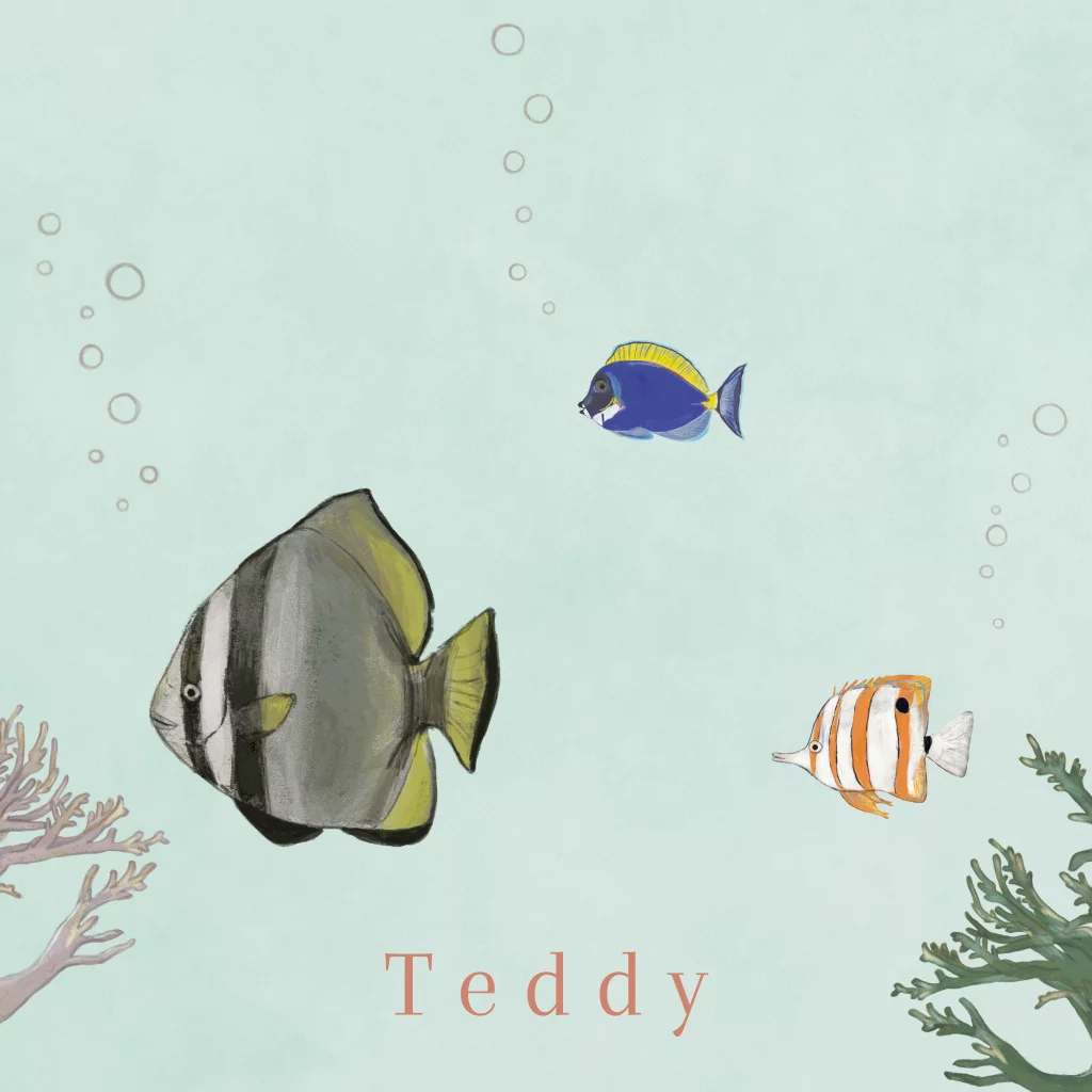 Prachtig geboortekaartje van een onderwater wereld met tropische vissen en zeeanemonen. Teksten en illustraties zijn helemaal naar wens aan te passen.