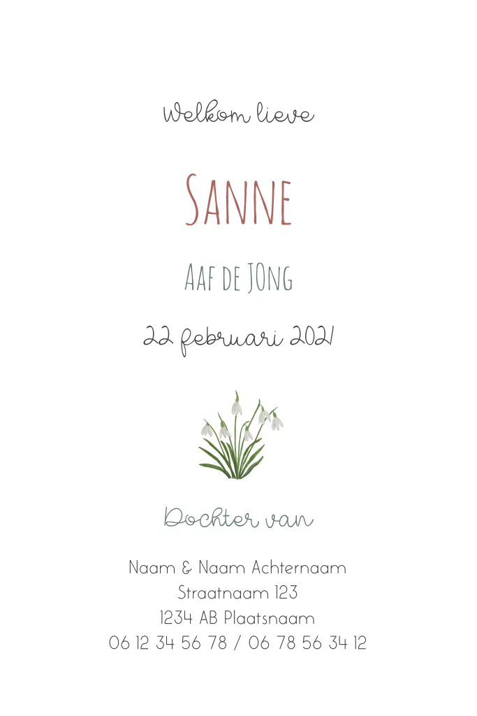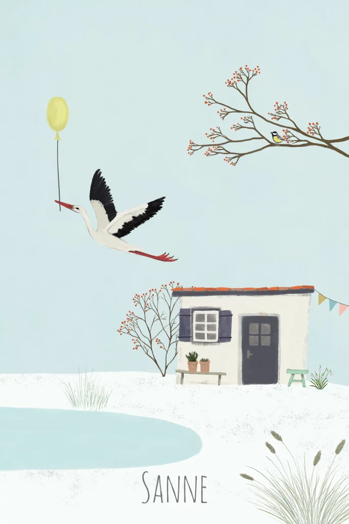 Dit geboortekaartje met een ooievaar die net een kindje naar het tuinhuisje heeft gebracht. In een winterse omgeving met veel bloemen en vogeltjes een prachtige aankondiging van de geboorte van je kindje in de winter. Teksten en kleuren kunnen worden aangepast voor een extra persoonlijk kaartje. Alle illustraties kunnen worden vervangen door illustraties uit de uitgebreide beeldbank.