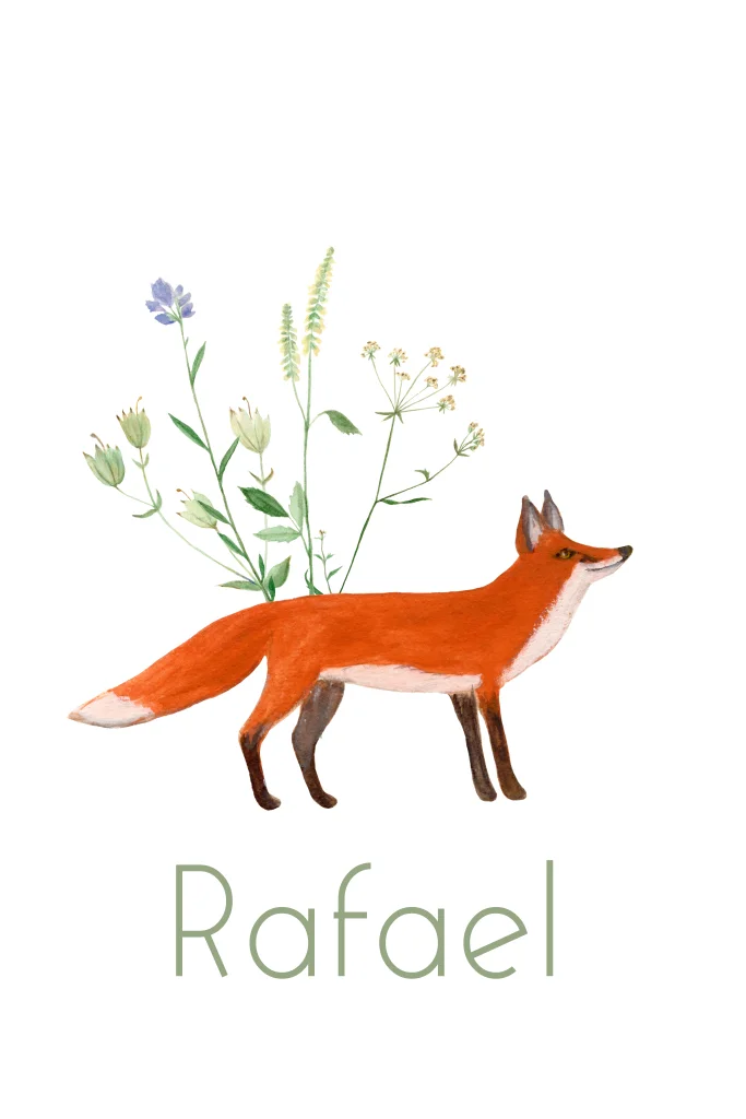 Lief geboortekaartje met een vos en wilde bloemen. De vos en de bloemen zijn geschilderd met gouache. Je kunt de kaart zelf helemaal naar wens maken in de editor. Niet alleen de lettertypes en -kleuren kun je aanpassen, maar je kunt ook (bijna) alle illustraties vervangen of illustraties en je eigen foto’s toevoegen! Mix & match!
