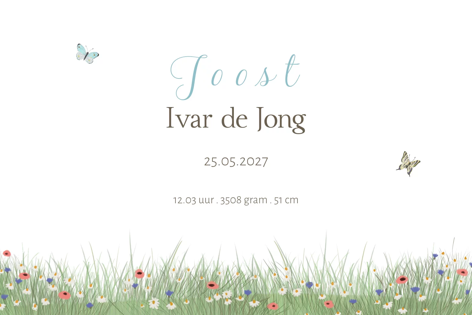 Lief geboortekaartje met je hond er op! De bordercollie staat trots bij het wiegje in een veld vol vrolijke bloemen, vlinders en vogels. Teksten en illustraties kunnen worden aangepast voor een extra persoonlijk kaartje.
