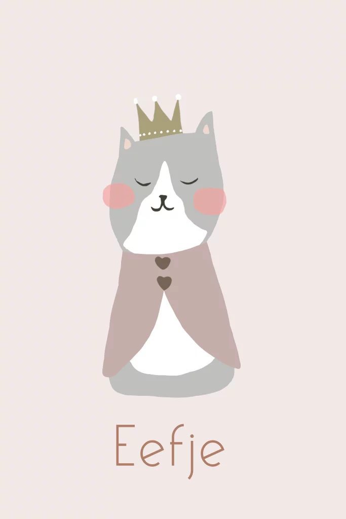 Lief geboortekaartje met een grijze poes. Je kunt de kaart zelf helemaal naar wens maken in de editor. Niet alleen de lettertypes en -kleuren kun je aanpassen, maar je kunt ook (bijna) alle illustraties vervangen of illustraties en je eigen foto’s toevoegen! Mix & match!