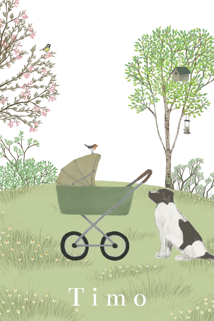 Lief verfijnd geboortekaartje met een kinderwagen in een bloemenweide. Met een trotse labrador en nieuwsgierig konijntje en vogeltjes. Een prachtige aankondiging van de geboorte van je kindje in de lente. Teksten en kleuren kunnen worden aangepast voor een extra persoonlijk kaartje. Alle illustraties kunnen worden vervangen door illustraties uit de uitgebreide beeldbank.