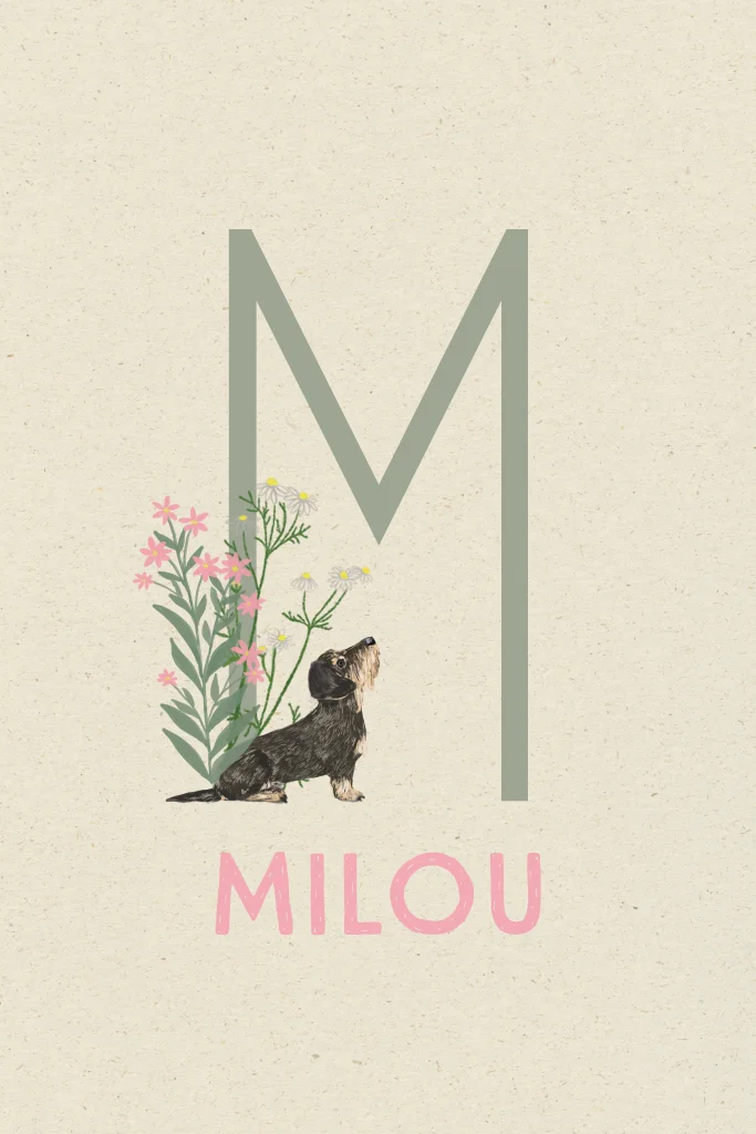 Lief geboortekaartje met de eerste letter van de naam van je kindje en een ruwharige teckel. Je kunt de kaart zelf helemaal naar wens maken in de editor.