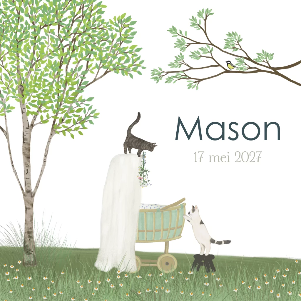 Dit geboortekaartje van een rotan wiegje met twee trotse katten is een prachtige aankondiging van de geboorte van je kind in de lente of zomer. Teksten en kleuren kunnen worden aangepast voor een extra persoonlijk kaartje. Alle illustraties kunnen worden vervangen door illustraties uit de uitgebreide beeldbank.