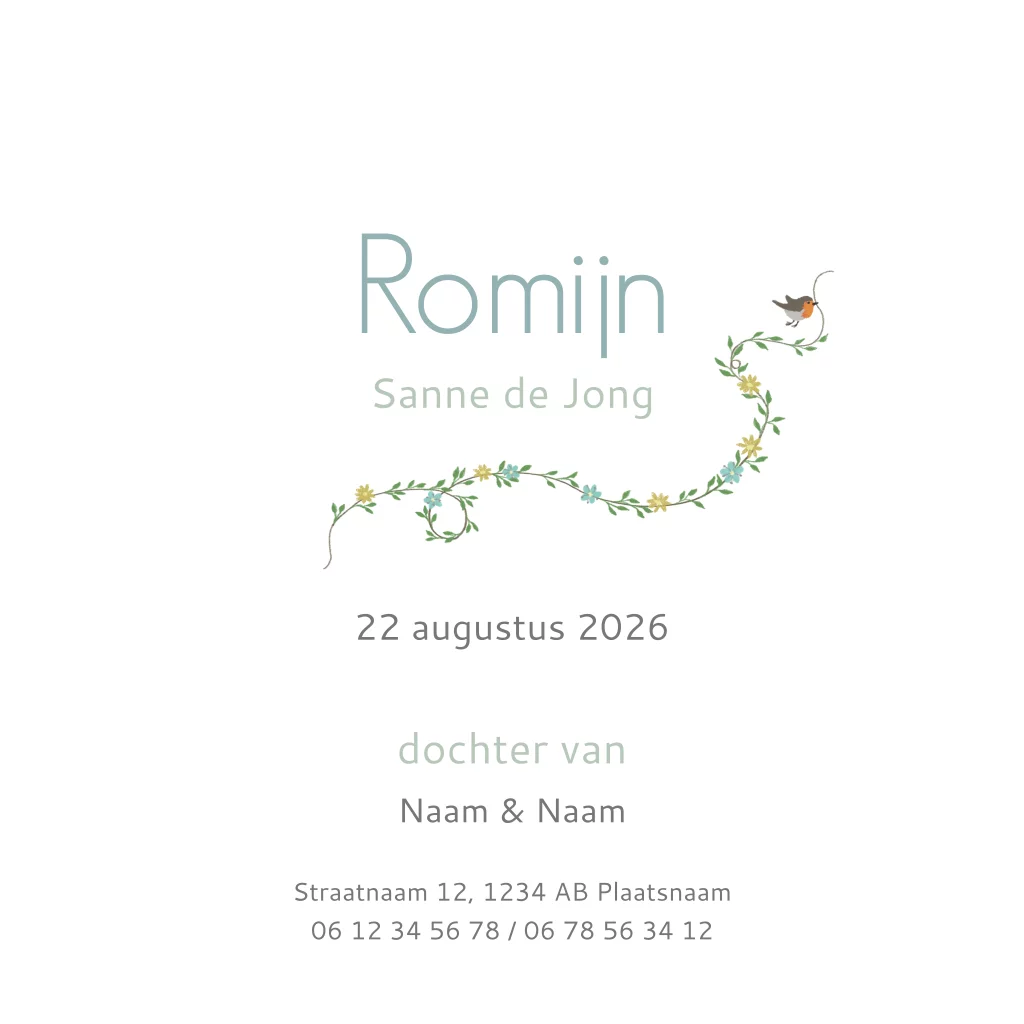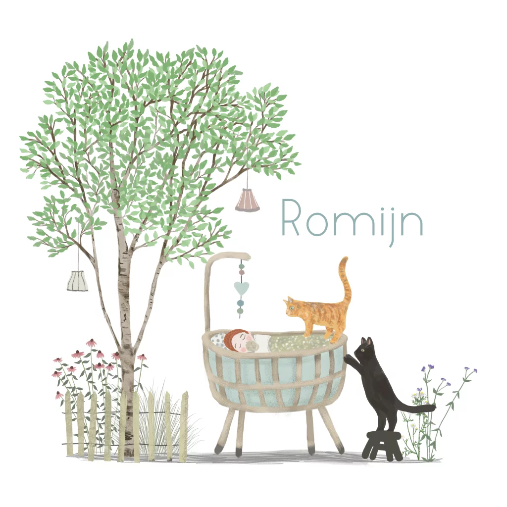 Lief geboortekaartje van een rotan wiegje onder een berkenboom en twee trotse katten. Met mooie zomerse bloemen en vogeltjes.