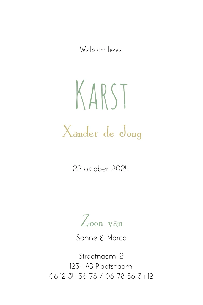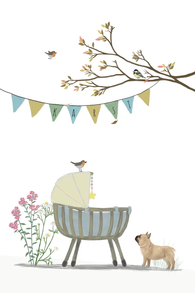 Dit geboortekaartje met een trotse Franse buldog en vogeltjes bij een rotan wiegje onder een herfsttak is een prachtige aankondiging van de geboorte van je kindje in de herfst. Teksten en kleuren kunnen worden aangepast voor een extra persoonlijk kaartje. Alle illustraties kunnen worden vervangen door illustraties uit de uitgebreide beeldbank. De buldog kun je dus ook heel makkelijk vervangen door een poes of grote broer of zus.