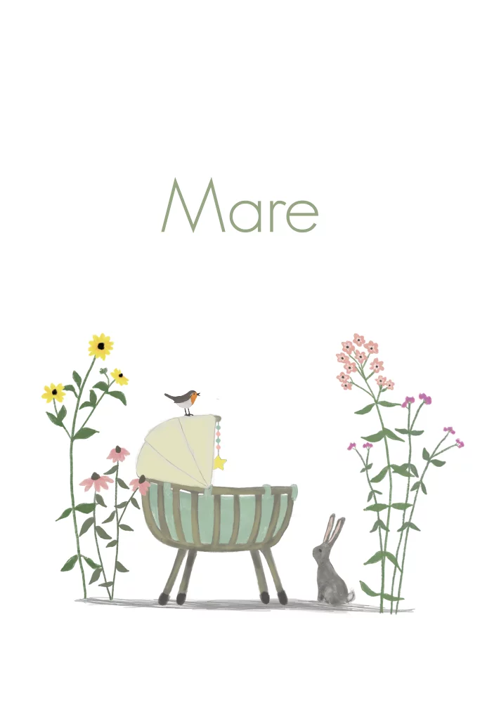 Lief geboortekaartje met een rotan wiegje met zomerse bloemen. Maak dit kaartje helemaal naar wens door de illustraties aan te passen met illustraties uit de beeldbank. Vervang het konijntje door een grote broer of zus. Of kies je favoriete bloemen.