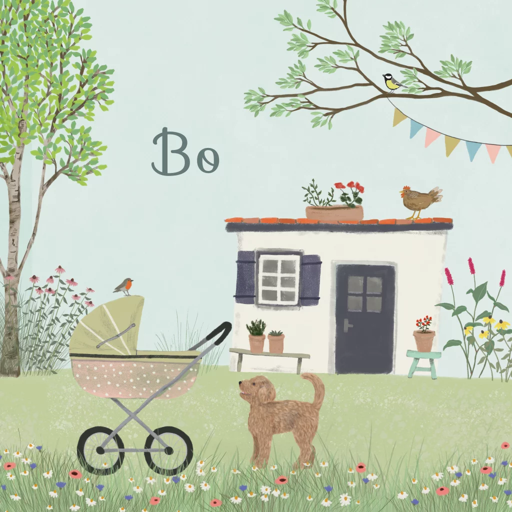 Kleurijk geboortekaartje van een tuinhuisje in bloementuin met een trotse labradoodle bij de kinderwagen. Een prachtige aankondiging van de geboorte van je kindje in de zomer. Teksten en kleuren kunnen worden aangepast voor een extra persoonlijk kaartje. Alle illustraties kunnen worden vervangen door illustraties uit de uitgebreide beeldbank.