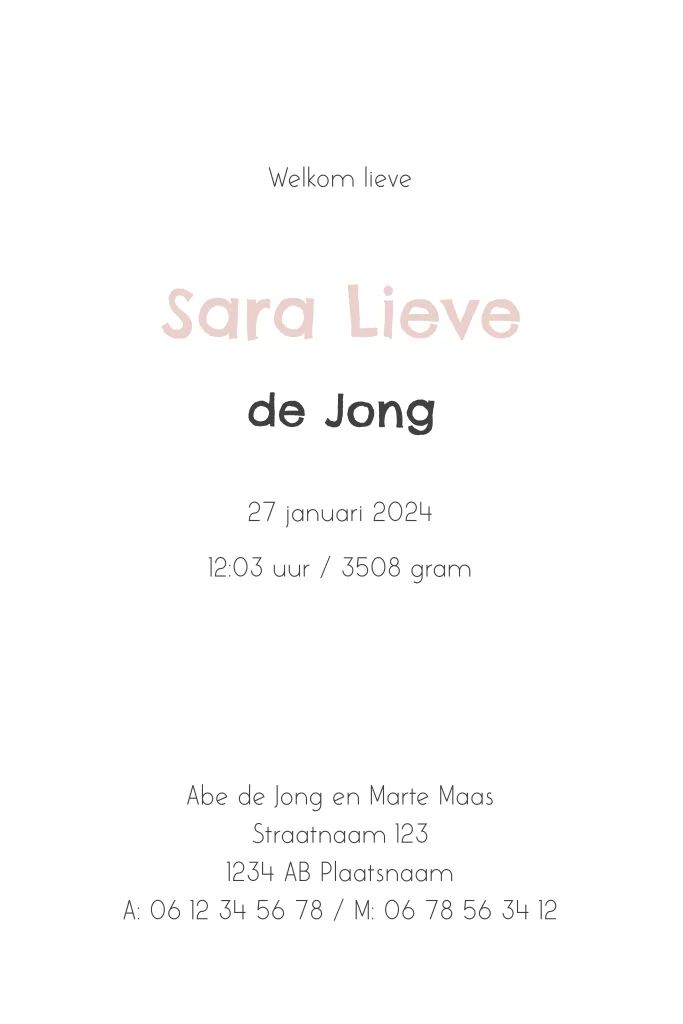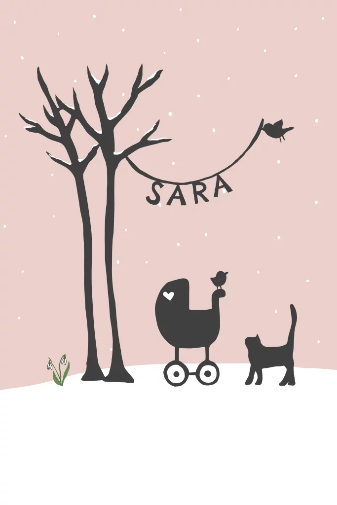 Lief geboortekaartje het silhouet van een trotse kat bij de wandelwagen in de sneeuw. Heel mooi voor een kindje dat in de winter geboren wordt. Vervang de poes heel makkelijk voor een grote zus of broer. Ook de kleuren kun je heel makkelijk aanpassen in de editor.