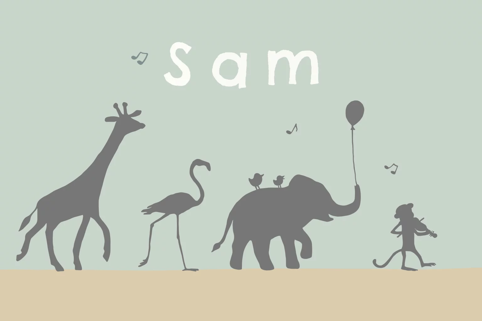 Geboortekaartje met een optocht van vrolijke silhouetten van jungle dieren: giraffe, flamingo, olifant en aap.