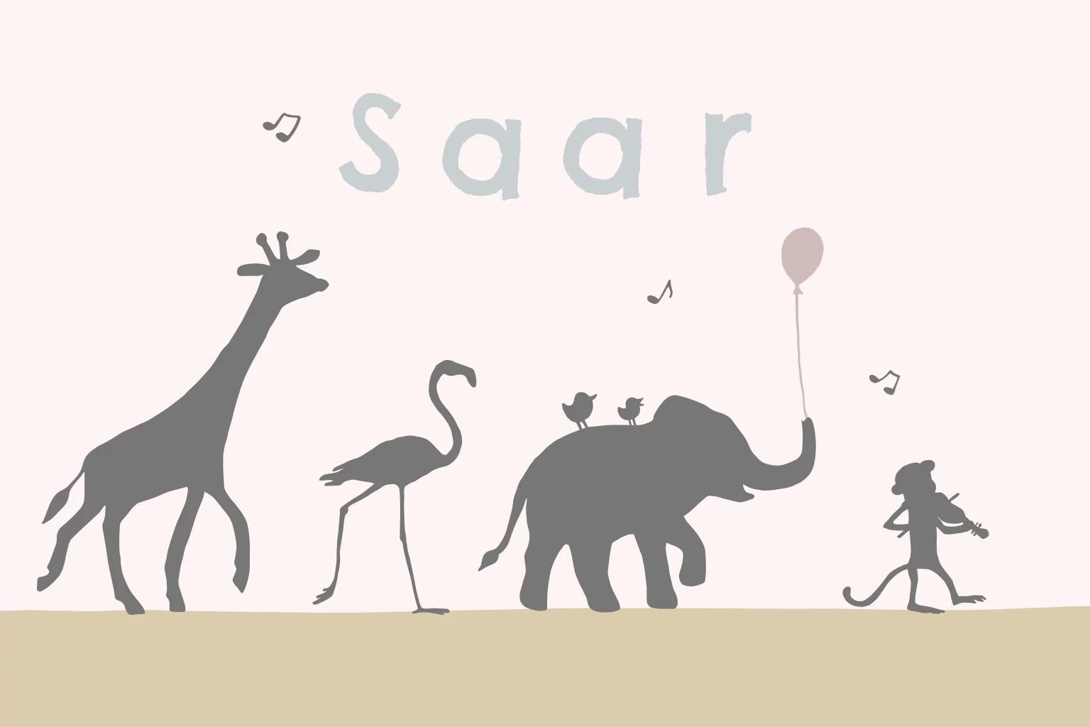 Geboortekaartje met een optocht van vrolijke silhouetten van jungle dieren: giraffe, flamingo, olifant en aap.