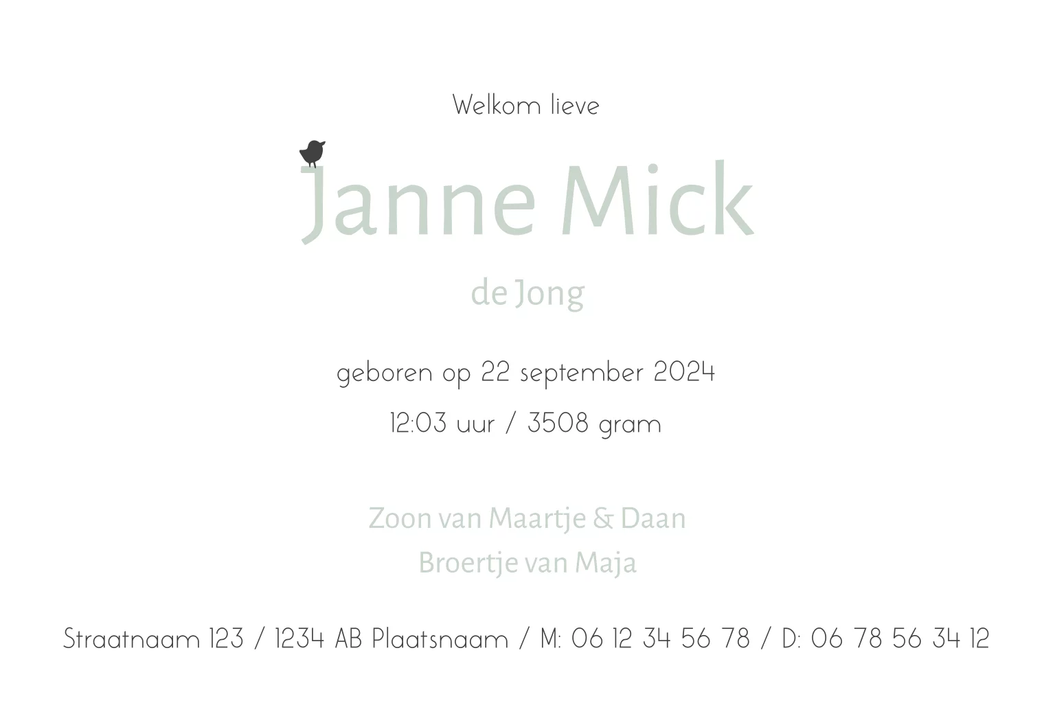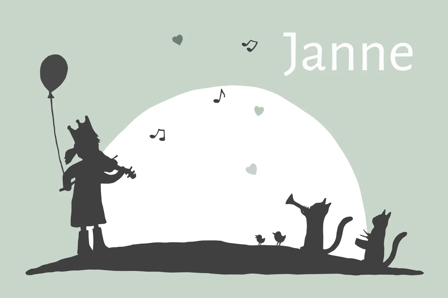 Vrolijk geboortekaartje met de silhouetten van een trotse grote zus en poezen die muziek maken. Vervang de grote zus heel makkelijk voor een grote broer of de poes voor een eekhoorn. Ook de kleuren kun je heel makkelijk aanpassen in de editor.