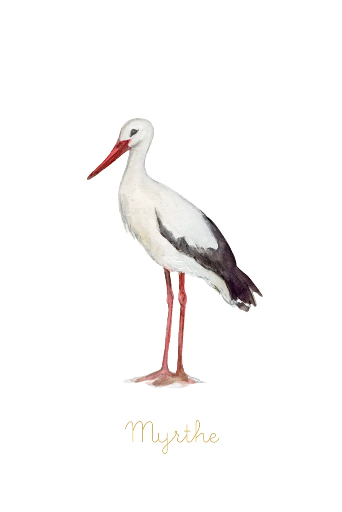 Geboortekaartje met een vriendelijke ooievaar. De originele illustratie is geschilderd met gouache.
