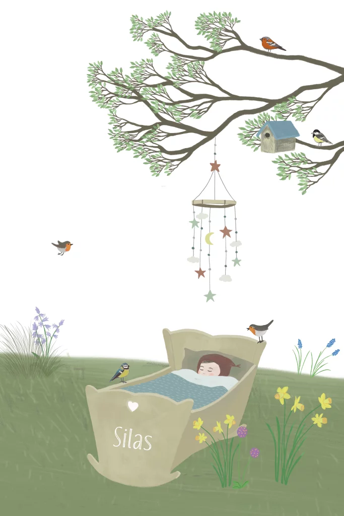Prachtig geboortekaartje van een slapend kindje in een ledikant in een lente omgeving. Teksten en kleuren kunnen worden aangepast voor een extra persoonlijk kaartje. Alle illustraties kunnen worden vervangen door illustraties uit de uitgebreide beeldbank.