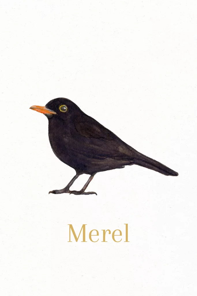 Geboortekaartje met een merel. De originele illustratie is geschilderd met gouache. Je kunt de kaart zelf helemaal naar wens maken in de editor. Niet alleen de lettertypes en -kleuren kun je aanpassen, maar je kunt ook (bijna) alle illustraties vervangen of illustraties en je eigen foto’s toevoegen! Mix & match! Mocht je er niet uit komen of vragen hebben, neem gerust contact op.