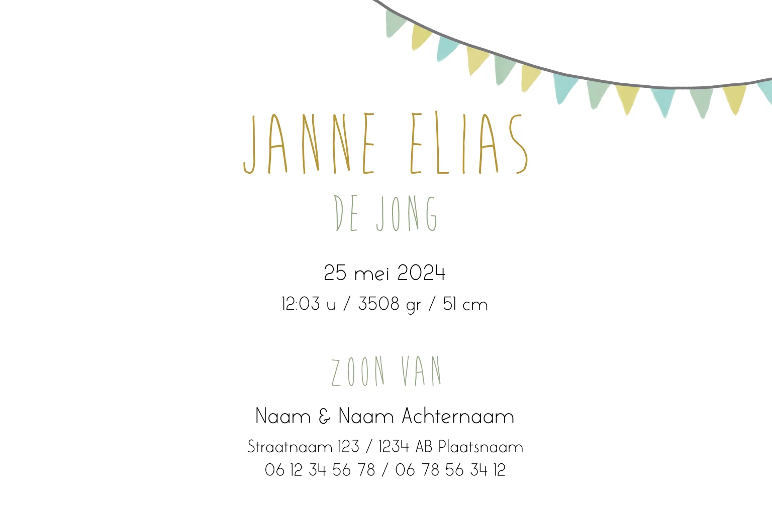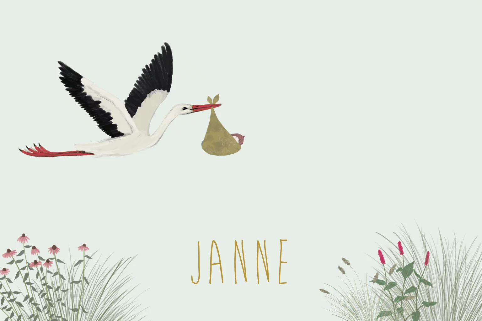 Dit geboortekaartje met een ooievaar die net een kindje komt brengen. Met mooie grassen en bloemen een prachtige aankondiging van de geboorte van je kindje. Teksten en kleuren kunnen worden aangepast voor een extra persoonlijk kaartje. Alle illustraties kunnen worden vervangen door illustraties uit de uitgebreide beeldbank.